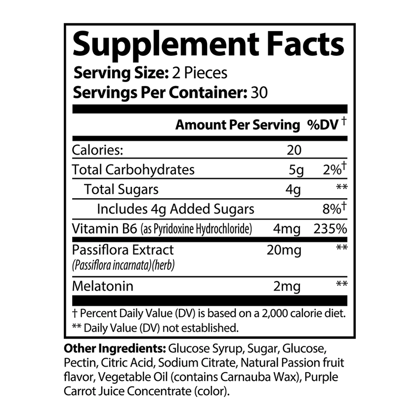 Ingredients: Passiflora Extract (Passiflora incarnate)(herb), Vitamin B6 (as Pyridoxine Hydrochloride), Melatonin, Glucose Syrup, Sugar, Glucose, Pectin, Citric Acid, Sodium citrate, Natural Passion fruit flavor, Vegetable Oil (contains Carnauba Wax), Purple Carrot Juice Concentrate (Color).